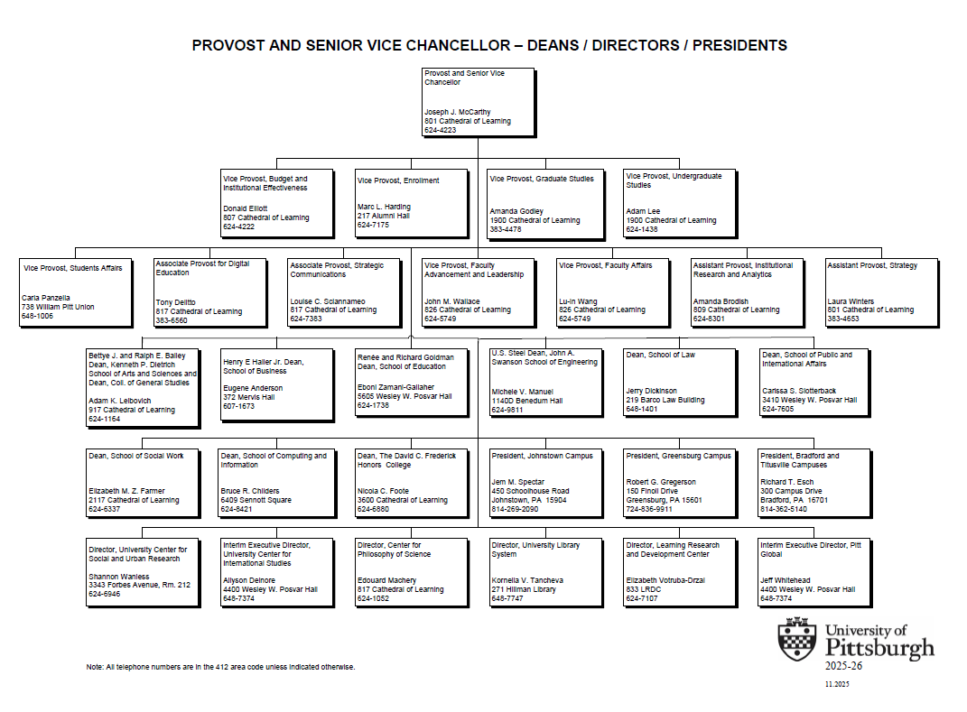 - Provost and Senior Vice Chancellor: Joseph J. McCarthy, 801 Cathedral of Learning, 624-4223